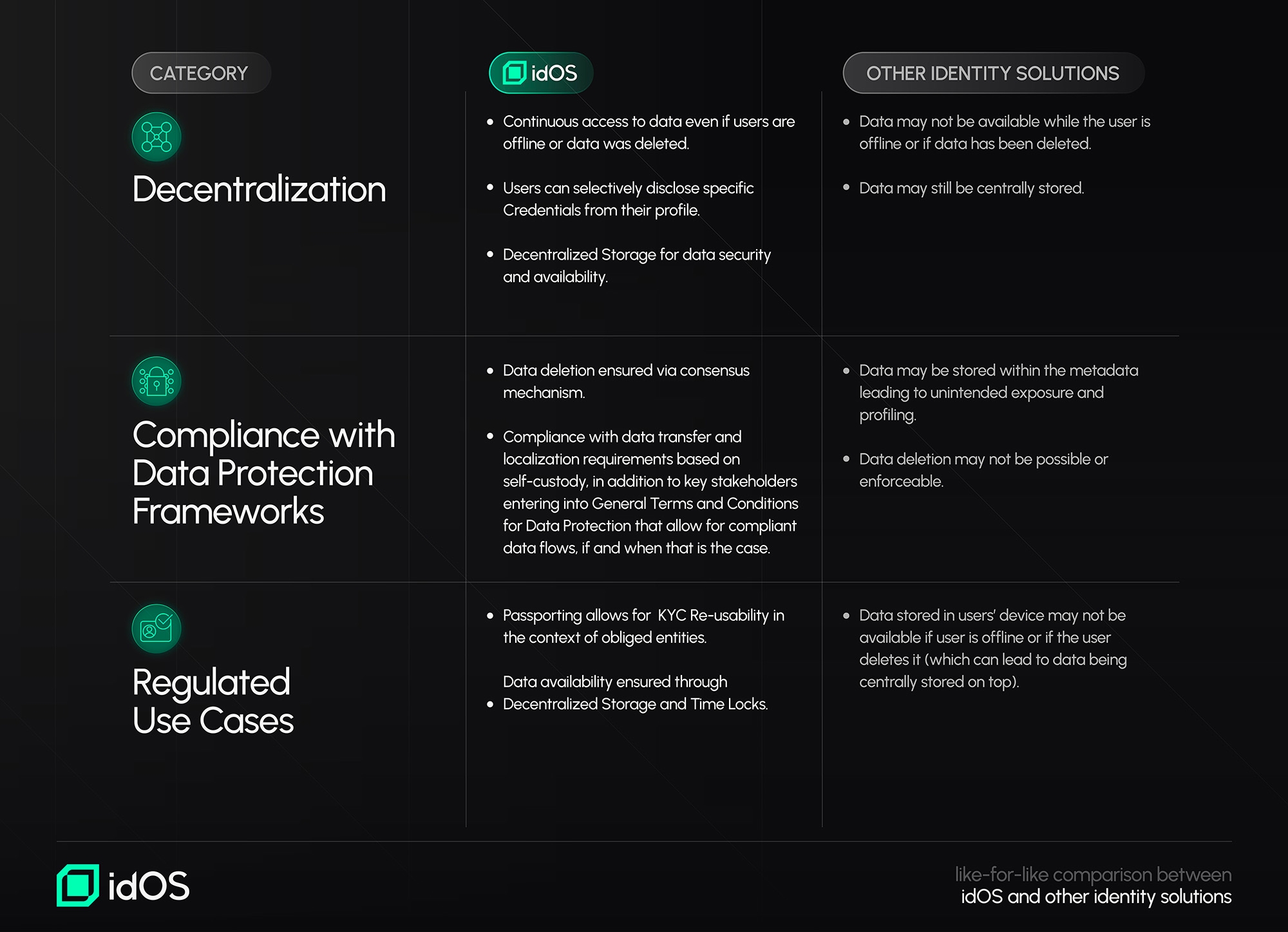 While various decentralized identity solutions offer valuable features, idOS combines user-centric control, data availability, and robust regulatory compliance. Its design ensures that data owners, data issuers, and data consumers can operate within a secure, flexible, and compliant framework, addressing the limitations observed in other approaches.