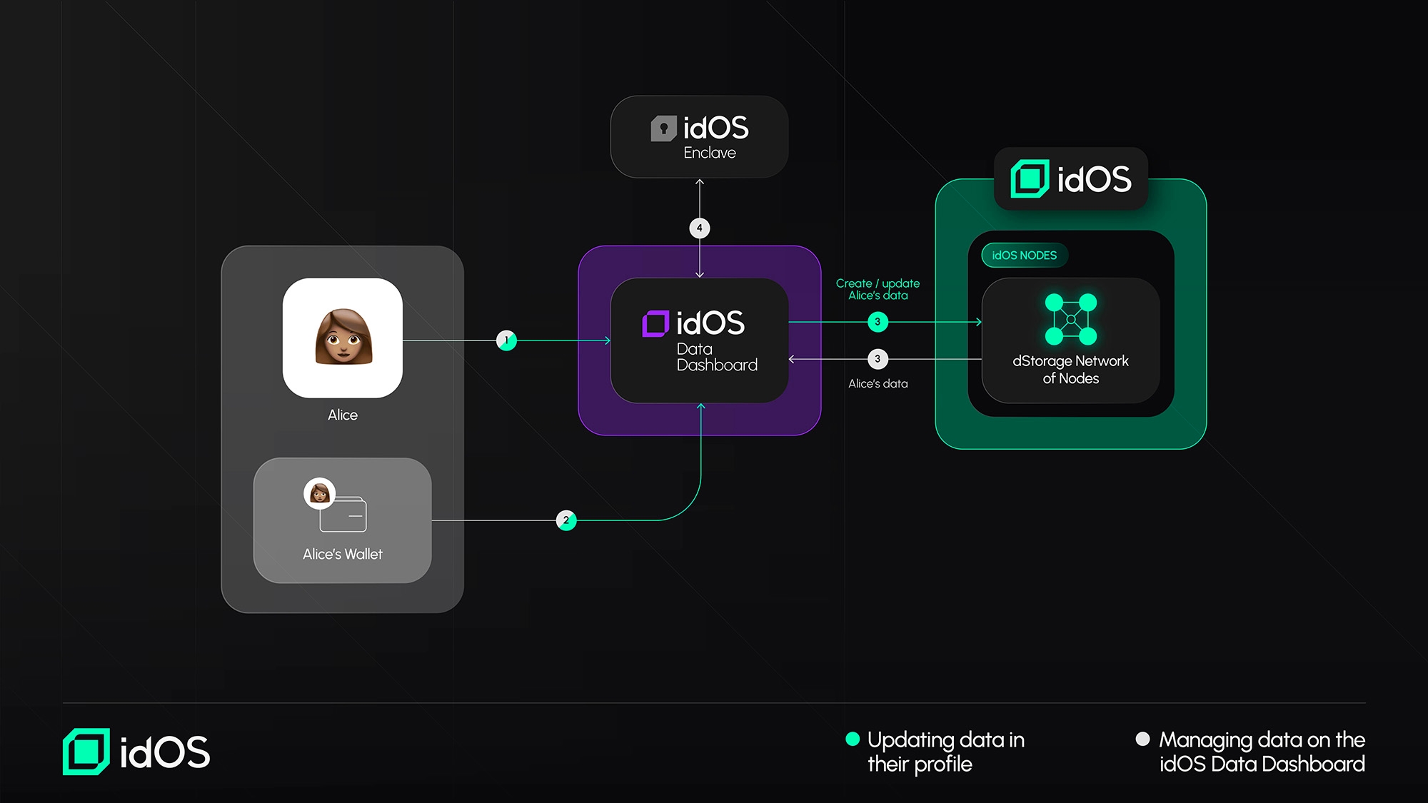 (A): Accessing Data in the idOS Profile: For Alice to see her data on a dashboard (e.g. the User Data Dashboard), she needs to (1) go to a data dashboard and (2) sign a message transaction with her wallet for the dashboard (3) to retrieve her idOS data. Afterwards she needs to decrypt the end-2-end encrypted data via an implemented idOS Enclave interface (4). (B): Updating Data in the idOS Profile: To change data on the dashboard, Alice (1) signs a message through her wallet (2) the dashboard then creates or updates her idOS data according to her input and (3) reloads Alice’s data from the idOS.