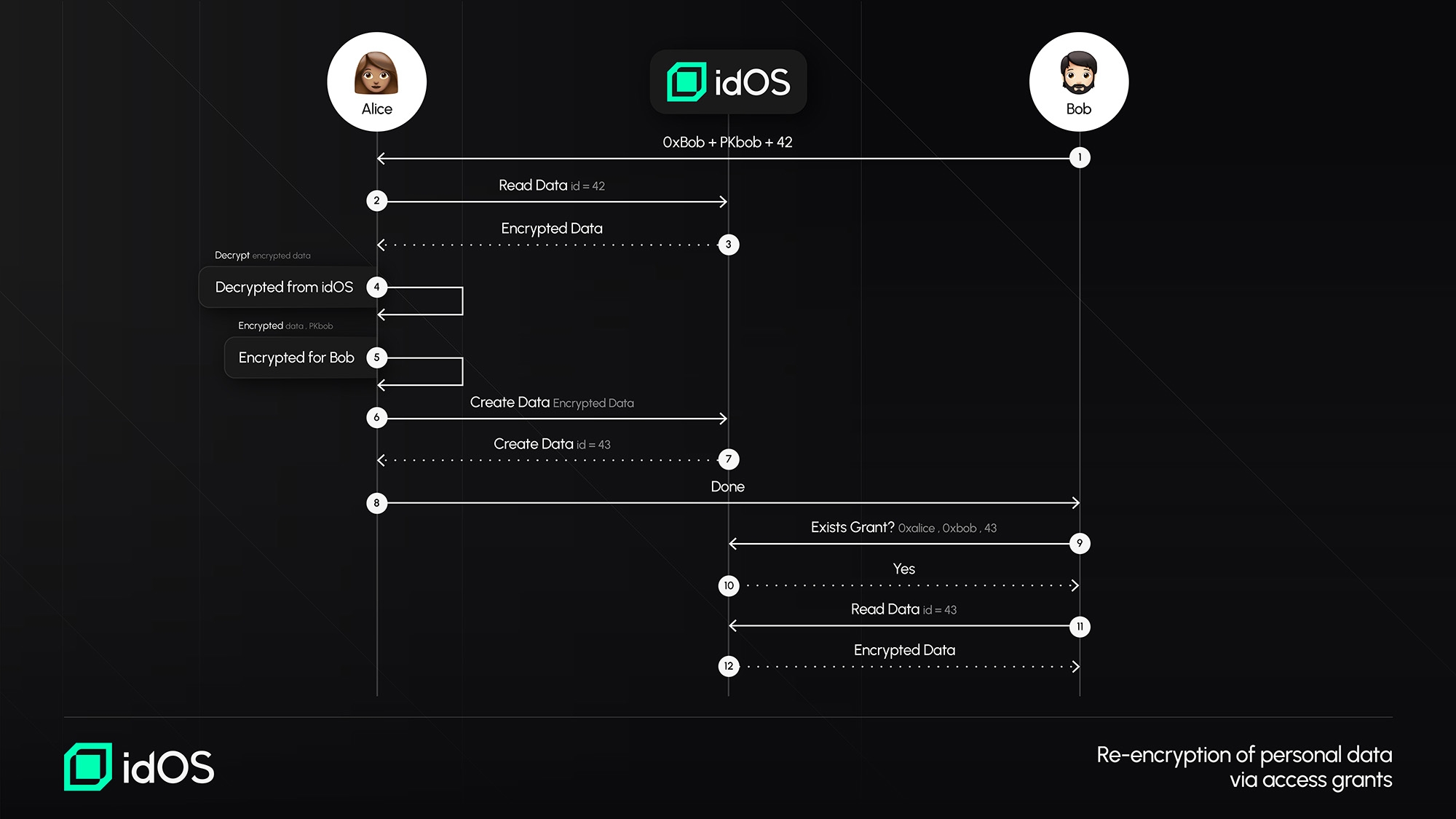 When data access is granted to a third party – If a user grants access to an entity (such as an app or institution), the data is decrypted by the user, re-encrypted with the recipient’s public key, and re-uploaded to the idOS network.